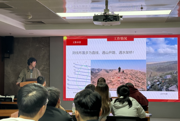 随后,刘宇同学以“矿集区野外物探经历与体会”为题,围绕野外物探工作的实际经历进行了分享。他结合多次一线实践,从出发前的准备、野外作业流程到现场可能遇到的复杂情况,系统介绍了野外工作的注意事项。