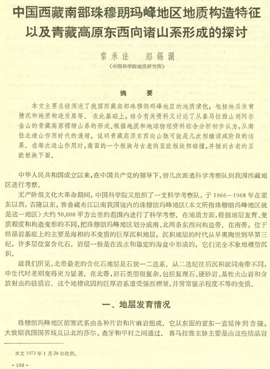 在我国同位素地球化学奠基人李璞的带领下,中国科学院科研人员于1973年首次测定珠峰峰顶灰岩年龄约为4.7亿年,这一结果也被该区域灰岩中发现的奥陶纪海相化石所印证,自此也证明了珠峰以及喜马拉雅山远古时代曾处于特提斯海之下。