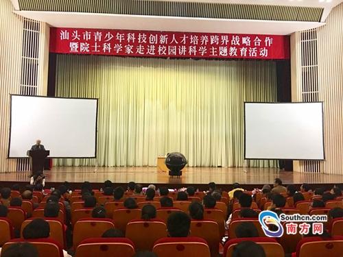 12月16日,汕头市青少年科技创新人才培养跨界战略合作暨院士科学家进校园讲科学主题教育活动在鮀岛影剧院举行启动仪式,来自汕头各中小学的1100名同学现场感受了院士科学家的风采。