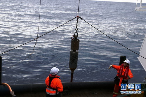 1月8日,科考人员在“海洋六号”后甲板投放重力柱,在南极海底取样。新华社记者王攀摄