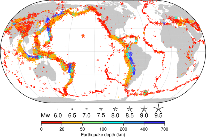 迄今为止,人类记录到的最大深源地震是2013年5月24日鄂霍茨克海8.3级地震(深度约607 km)和1994年6月9日玻利维亚8.3级(也有报告说为8.2级)地震(深度约637 km)。人类记录到的最深的大地震是2015年5月30日发生在日本小笠原群岛的7.9级深震(日本气象厅测定8.1级),国际地震中心最终确定的震源深度为685.5 km。