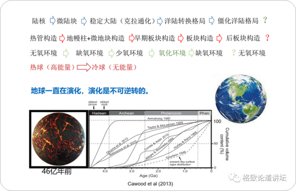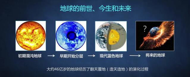 地球从陆核到大陆、从无板块构造到有板块构造、从无氧到现在有氧,将来还会怎么样?还会不会变成没氧?这都是人们要讨论的问题。所以我们讲整个地球的演化是从热到冷,什么时候地球完全凉了,地球就“死”了。地球特别热的时候没有生物,等到了合适的温度才开始有生物;等到再继续冷了又没有了。这就是地球的演化历史。