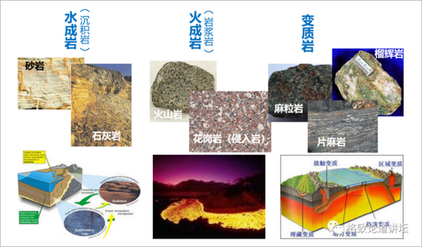 那么大陆地壳是由什么组成的?是由岩石组成的。岩石有三类,一类叫水成岩,也叫沉积岩,还有火成岩和变质岩,其中火成岩包括火山岩和侵入岩。变质岩是指受到地球内部力量(温度、压力等)改造而成的新型岩石。水成岩、火成岩和变质岩都可以再经过变质。这些石头从地壳浅层“跑”到深处,10公里以下、20公里以下、30公里以下、40公里以下,再次发生变化,不再是原来的结构,而成为另一种矿物。变质岩记录了地球表层岩石所发生的翻天覆地的变化。