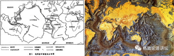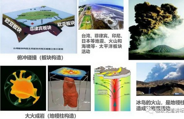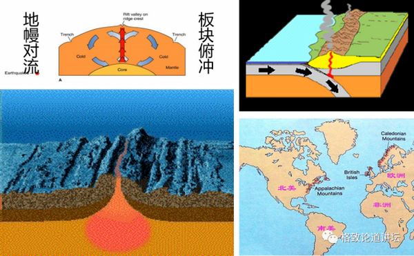 板块构造的深刻道理包括地幔对流、洋底扩张。就像左边这张图,红色岩浆不断喷出来往两边走,形成洋底扩张。右上方是板块俯冲,右下方是欧洲和北美曾经有一条连续的山脉。