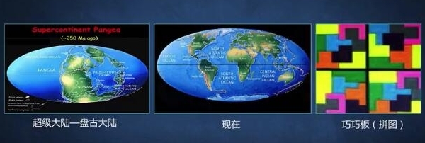 板块构造理论就像一个巧巧板拼图。在2.5亿年以前,各个大洲基本上是连在一起的,后来逐渐分开了、漂开了,成了不同的大陆,就是现在的样子。