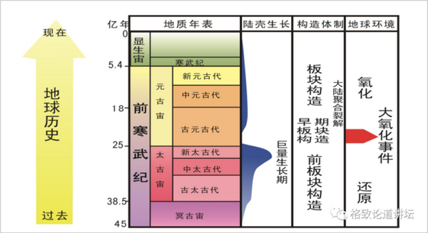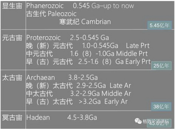 现在我们通过地质年表来了解地球基本历史:45.6亿-38亿年前这段叫冥古宙,38亿-25亿前是太古宙,25亿-5.45亿前叫元古宙,从5.45亿前到现在叫显生宙。每一个阶段、每一个事件都有科学家在研究、在追踪。