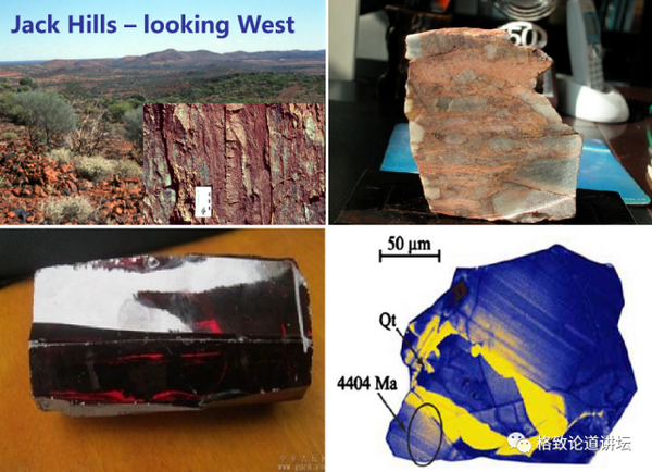 那水是怎么来的呢?在44亿年前的锆石里就发现了水的作用,但是不是宏观水还不知道。右下图能看见厚厚的岩层,它们都是水里沉下来的岩石,所以那时是有宏观水的,39亿年前就有宏观水。我们仍然要研究宏观水,研究地球的演化规律:构造的演化、矿物的演化以及生物的演化,演化是地球重要的科学前沿。