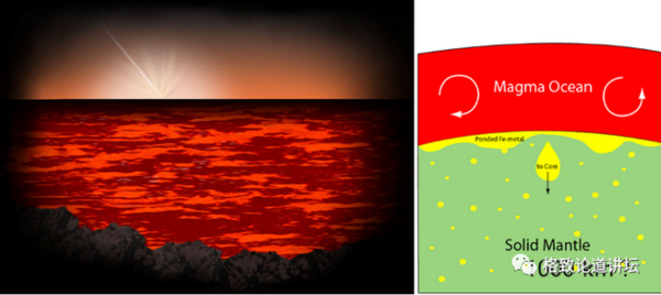 如果先有洋,我们假设一个硅酸盐的洋,就像图中的红色“大洋”,其中二氧化硅占比大概有40%-52%。这个洋如果可以在上面分异出一个陆壳,下面分异成地幔,就可以解释陆壳的成因。但是这个模式在地球上不行,对月球倒可以用。因为月球上面的陆壳是斜长岩壳,而地球大陆是花岗岩壳,所以行不通。