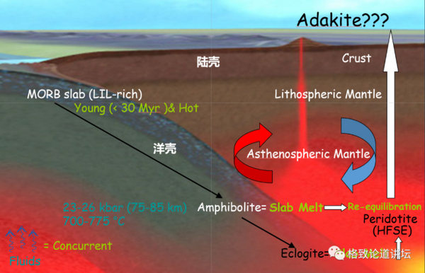 假设先有洋壳,通过洋壳俯冲到一定深度时再部分熔融,熔出来的部分变成陆壳。部分熔融的意思就是熔化一部分,容易熔的熔化了,不容易熔的没熔化。但这也遇到很大困难,计算模式存在问题。