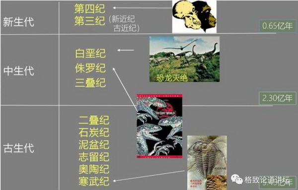 显生宙阶段可以用化石记录地层了,这是我们看到的地质时代分布,从三叶虫一直到恐龙灭绝。