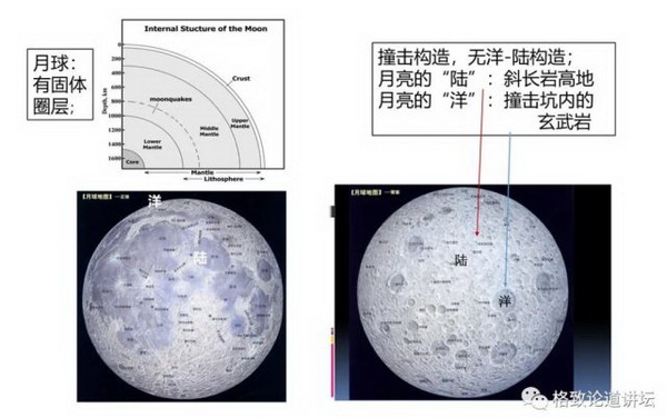 虽然月球跟地球有亲密的关系,但它们的演化历史很不相同。月球是撞击构造,没有海洋、大陆,自然也没有进入板块构造阶段。