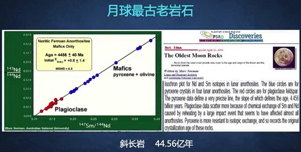 那么月球的年龄有多少?它的斜长岩陆壳年龄是44亿年,与地球上最老的花岗岩一样。