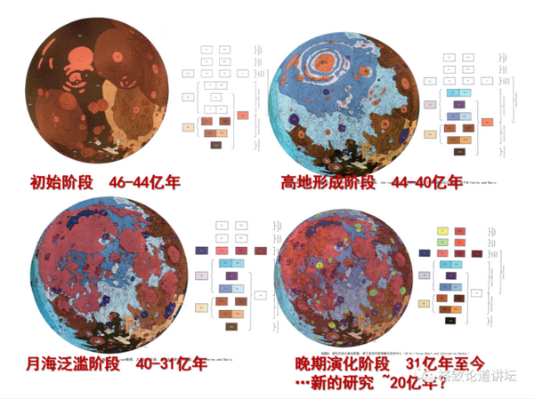 我们看到一期又一期的陨石撞击月球,就是一期一期的月球演化。后期的撞击坑覆盖了前面的,科学家对它们进行探索,通过最年轻的月海计算出月球何时“死亡”。