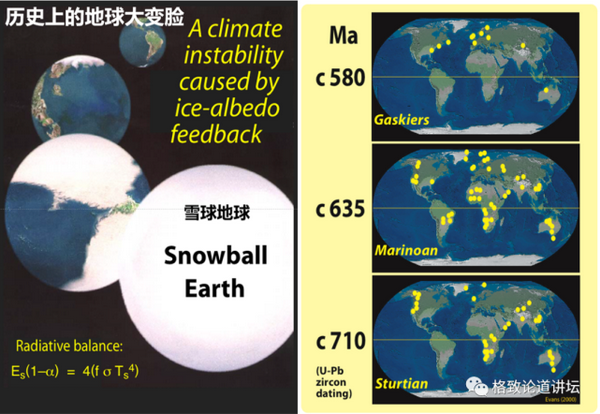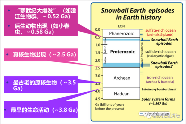 氧是从何而来的?它怎么会突然升高?有很多假设,其中有一个叫雪球假设。7亿年前地球叫雪球地球(Snowball Earth),从赤道到两极都是冰雪覆盖,后来二氧化碳发生变化,冰融化导致了氧气的出现。