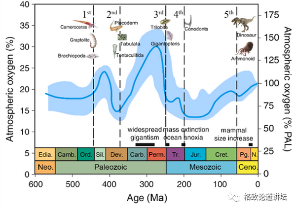 地球历史上两大氧化事件给地球带来了现今的繁荣,氧气浓度的变化造成了动物的进化。动物不断地出现,从最早的微生物一直到高级生命,这是不是永远恒定地演化?每天都是这样演化过来的?不是,是跳跃式的发展。在有了比较高级的生命之后,还会发生氧的突然降低与升高,地球历史上多次生命大灭绝都与此相关,如恐龙大灭绝。