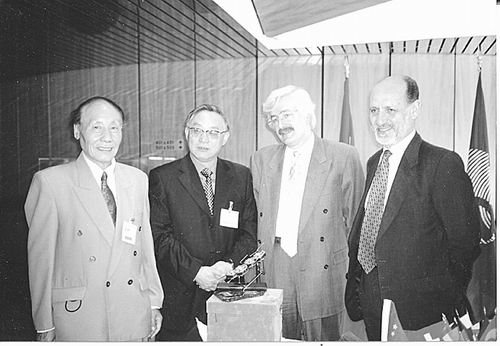 2001年7月9日,在巴黎欧空局本部签署“双星计划”后合影。(左起:刘振兴、中国航天局局长栾恩杰、欧空局科学项目部主任D.J.Southwood、欧空局局长A.Rodata)。