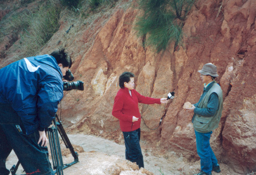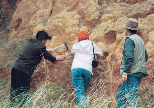 一年多来,中国科学院几位资深科技工作者在晋江深沪湾金屿村附近第三级海成台地红色砂层中发现了时代为距今80—50万年的旧石器。图为袁宝印(左)、侯亚梅(中)、黄慰文(右)在观察野外剖面。(池涵摄)