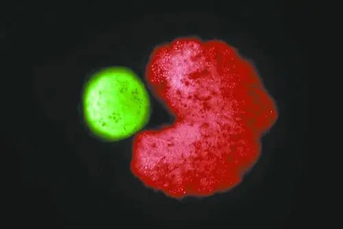 一个活体机器人将单个细胞组装成一个新的细胞团 图片来源:Douglas Blackiston