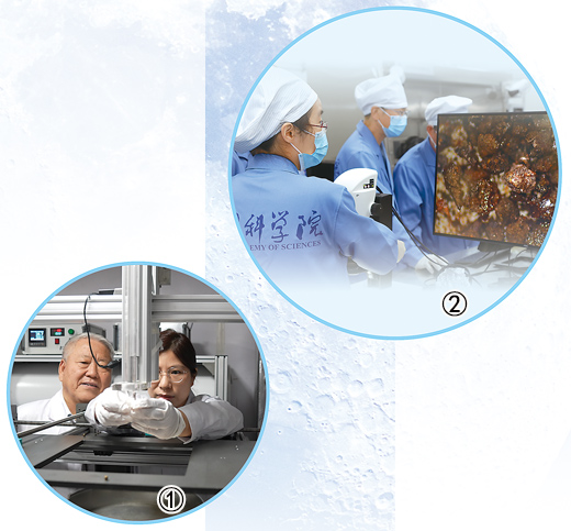 图①:中国科学院地质与地球物理研究所科研团队向超导磁力仪中放置月壤样品。