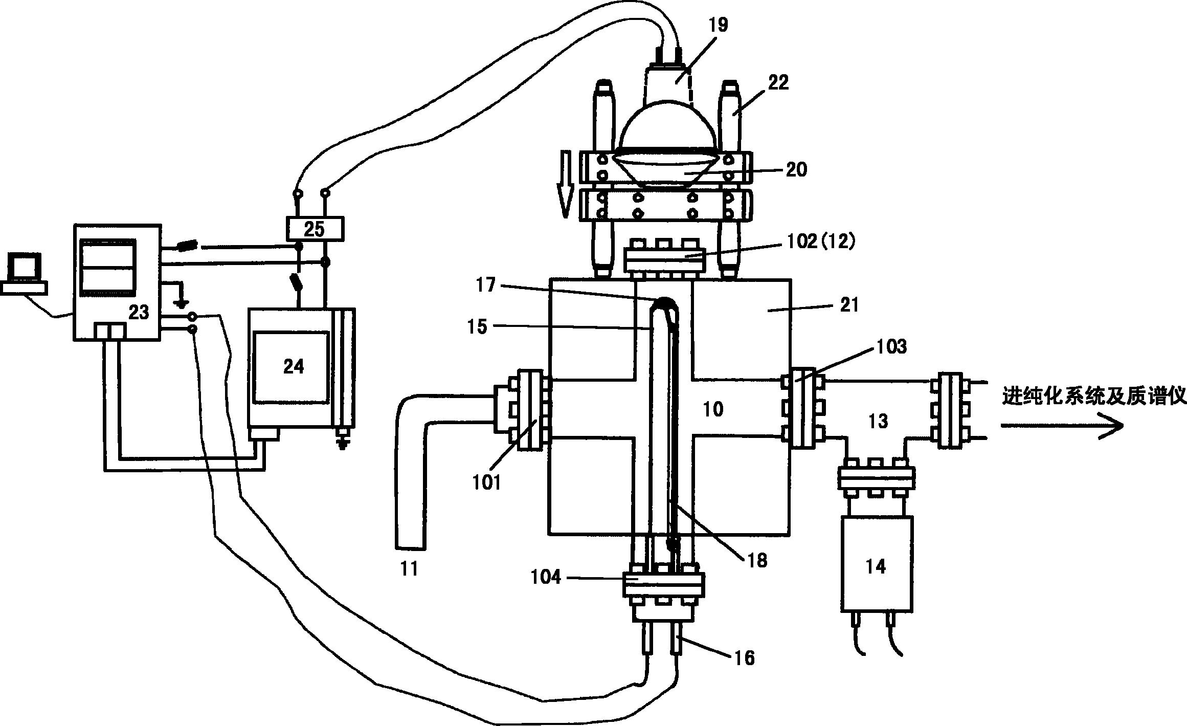 一种用于惰性气体扩散实验的真空聚焦炉装置,包括一真空样品仓,该真空样品仓为四通体,其中一通设有对应投影灯的视窗,其余三通分别连接冷阱、电极及质谱仪;其中:真空样品仓内的热电偶顶部固定有样品包,该样品包位于视窗聚集的光路上,热电偶的温度通过温度控制器控制电源控制器改变投影灯的输出功率。本发明结构简单,费用低廉,可有效进行惰性气体扩散实验,实现样品的精准加热。 |