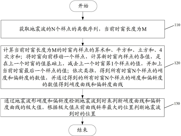 一种检测地震信号的控制方法及系统,包括:获取地震波的N个样点的离散序列;计算当前时窗内样点的算术和、平方和、立方和、4次方和;将时窗向前移动一个样点,计算新时窗内样点的各值,是在上一个时窗的值基础上,减去上一个时窗第1个样点的值,并加上当前时窗最后一个样点的值,依次类推,得到所有时窗N个样点的峭度和偏斜度的数值得到峭度曲线和偏斜度曲线,判断地震波到时的位置。本发明解决了当前传统的基于地震波形峭度和偏斜度的检测方法存在运算量过大导致效率低的问题。