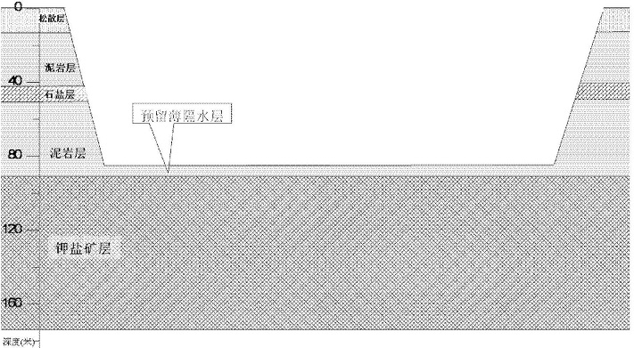 一种热带季风气候条件下固体钾盐矿露天开采方法,其特征如下:a)开挖上覆盖层时,在固体钾盐矿层上留出一层泥岩层作为隔水层,在采坑的底部形成一个具有保护作用的施工作业面,使雨水不直接直接接触固体钾盐矿层;b)在隔水层上搭棚分区开采;或在旱季时采矿和回填。本发明克服了热带季风气候条件下年降雨量大等不利因素,可以对埋藏深度较浅的固体钾盐矿进行露天开采,不受降雨的影响,其优点是高效快捷、经济环保,具有巨大的实用价值,经济效益极为可观。