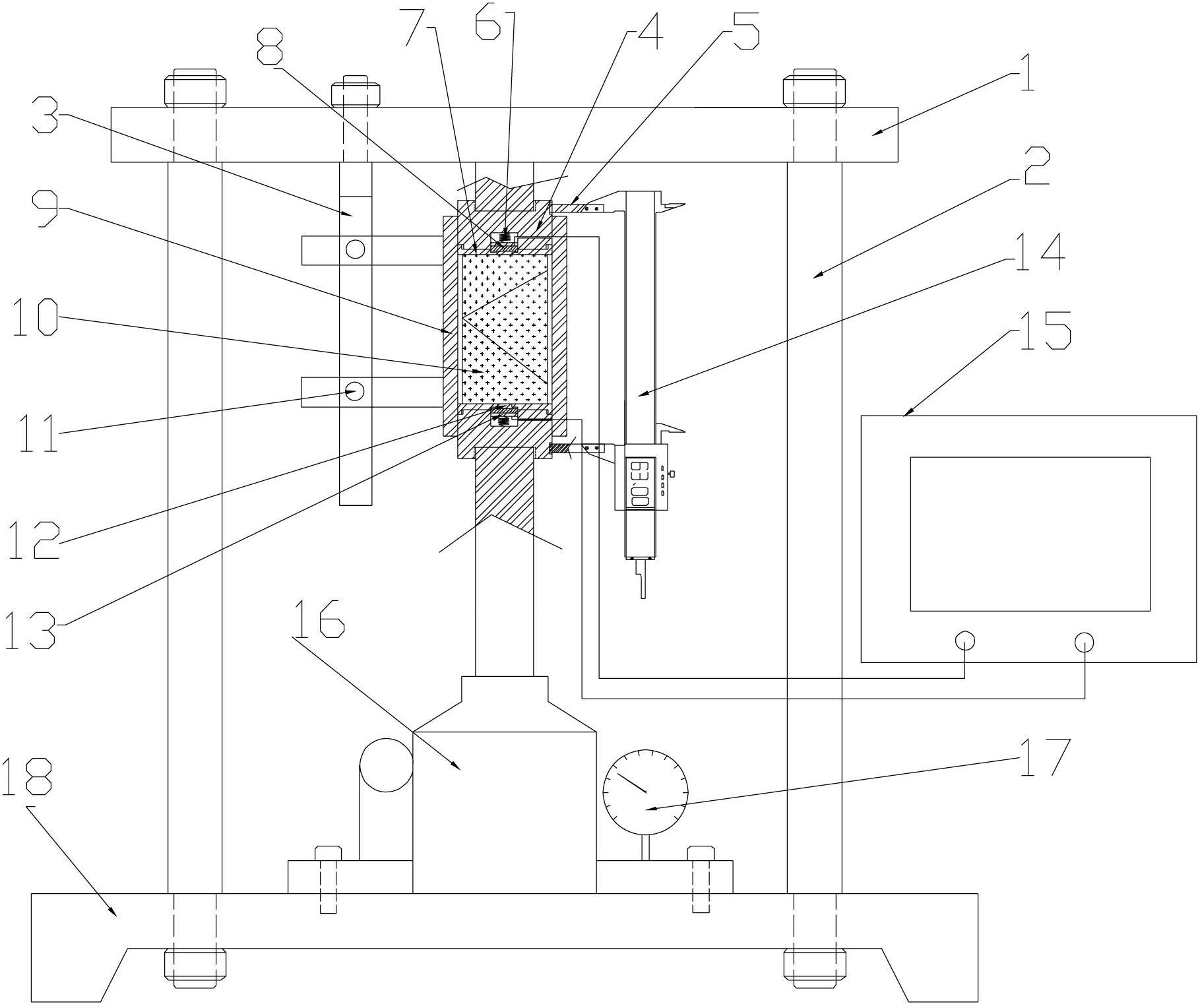 本发明公开了一种岩体试件超声波测试设备,包括框架装置、岩体试件约束装置、两个超声波换能器和加压装置;所述岩体试件约束装置为固定于框架装置内部的套筒(9),岩体试件(10)及设于该岩体试件(10)两端的两个超声波换能器由该套筒(9)支撑;所述框架装置的底部设有加压装置,该加压装置抵接加压岩体试件(10)底端的超声波换能器,同时岩体试件(10)顶端的超声波换能器抵接所述框架装置的顶部。该测试设备的结构设计能够用来测量不同法向压力下完整岩体试件、平行节理岩体试件、倾斜节理岩体试件等不同类型的岩石试件的声波速度和幅度。 |