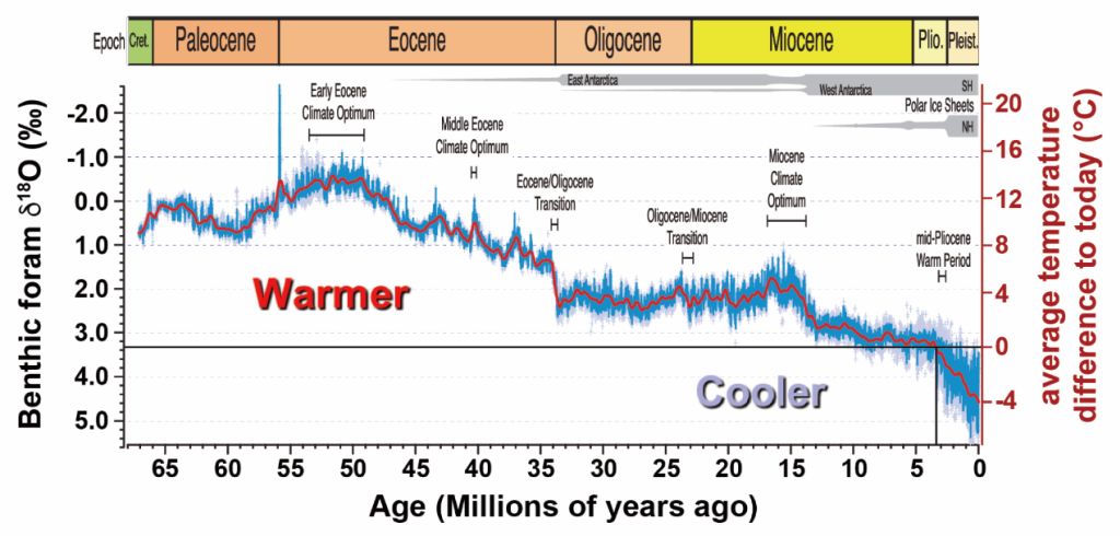 从地质证据来说,地质历史时期的气候与现今气候相比非常不同。那么,我们的地球是否曾经出现过温度比现在还高的情况呢,答案是肯定的。晚白垩世以来深海底栖有孔虫化石记录的氧同位素(δ18O)证据表明,在早始新世时期,全球温度是最高的,被称为早始新世大暖期(Early Eocene Climate Optimum: EECO),从这之后全球逐渐降温(Westerhold et al., 2020)。其中在始新世/渐新世转换期(Eocene/Oligocene Transition),中新世大暖期(Miocene Climate Optimum)和中上新世暖期(Mid-Pliocene Warm Period)三个时期的降温最剧烈(图4)。在地质历史时期,地球温度的变化主要受控于大气中二氧化碳浓度的变化。过去的65 Ma以来,全球出现了多次温室气候事件:比如距我们最近约3 Ma的上新世暖期(Pliocene Climatic Optimum)和距今17-14 Ma的中新世暖期(Miocene Climate Optimum)。而按照目前的碳排放趋势,未来100年后的地球大气二氧化碳浓度会达到中新世暖期的水平。