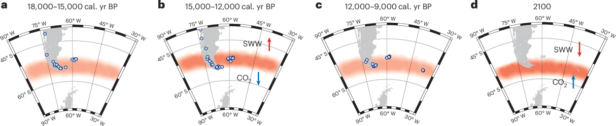图3 南半球西风带的过去及未来变化。a-c图揭示了末次冰盛期以来三个时段南大西洋核心西风带(红色)的移动路径。d图为基于CMIP6模式在高温室气体排放情景(SSP5-8.5)下对2100年西风带的预期变化。蓝点标示了各时间段内泥炭开始发育的地点。红色阴影的深浅表示风的强度,颜色越深代表西风越强