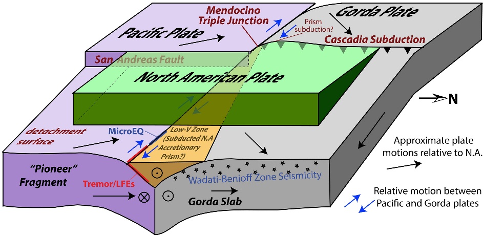 板块的几何形态与相对运动模式,是评估地震危险性和理解断层相互作用的物理基础。位于北美西海岸的门多西诺三联点(Mendocino Triple Junction),作为太平洋板块、北美板块和戈尔达板块(胡安-德富卡板块南部)的交汇处,构成了圣安德烈斯走滑断裂系统(转换边界)与卡斯卡迪亚俯冲带(汇聚边界)之间复杂的构造分界区域(Atwater,1970; McKenzie, 1969)。长期以来,对其深部构造的认识存在两种竞争性模型:一种认为向南俯冲的戈尔达板块后方已形成“板片缺口”,导致软流圈物质上涌(Dickinson et al., 1979);另一种则认为,一个古老的“先锋碎片”(古法拉隆板块的残余)被太平洋板块捕获,并随之向北迁移,填充于戈尔达板块南缘之下(Bohannon and Parsons,1995)。这两种模型对板块边界形态、深部过程及潜在地震风险的预测截然不同,但由于缺乏直接约束该碎片现今运动状态的关键证据,相关争议长期悬而未决。