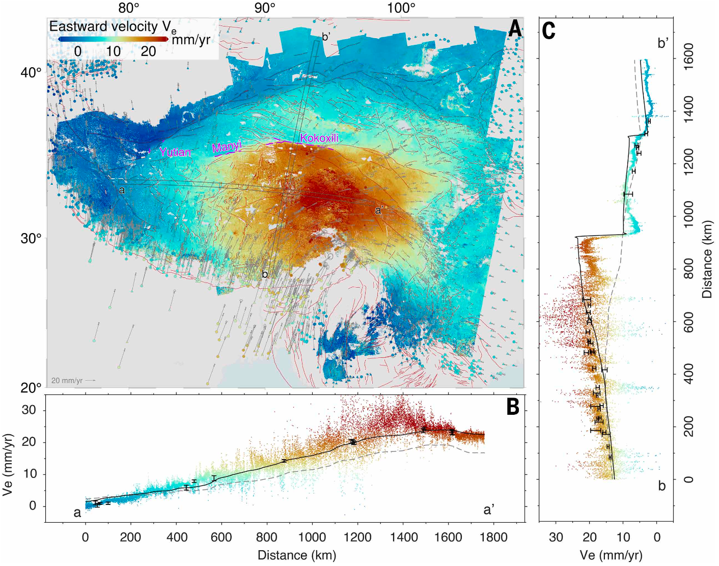 青藏高原,这片被誉为“世界屋脊”的广袤区域,是地球上规模最大、最活跃的陆内构造变形区。约5500万年来印度构造板块与欧亚大陆的碰撞,形成了一个从南部的喜马拉雅山脉、穿过青藏高原、延伸至中亚的广阔地壳形变区(England and Molnar, 1997; Yin and Harrison, 2000)。大陆变形通常表现为连续的弥散变形与岩石圈尺度断裂上的应变集中共同作用的结果(Avouac and Tapponnier, 1993; Thatcher, 2007; Bürgmann and Dresen, 2008; Wang and Barbot, 2023; Fang et al., 2024a)。大陆变形区内许多小尺度地震活动,可以由浅部地壳块体与深部韧性基底耦合变形来解释(Bourne, 1998)。传统的构造模型通常认为,青藏高原的变形主要由少数大型主干断裂(如阿尔金断裂、昆仑断裂、嘉黎断裂)分隔的刚性块体运动所控制,这些断裂承担了大部分的水平走滑和垂直挤压变形(Molnar & Tapponnier, 1975)。由于以往大地测量观测的空间分辨率与覆盖范围有限,这些主要断裂带在控制整体形变场中的作用一直难以定量评估。