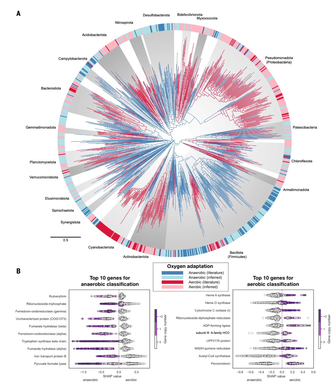 为回答这一关键问题,近日,来自澳大利亚昆士兰大学、匈牙利厄特沃什·罗兰大学、日本东京大学等十几家机构的研究团队合作在Science发表了一项具有里程碑意义的研究成果(Davín et al., 2025)。该研究整合了细菌基因组数据、机器学习预测、系统发育协调分析和分子钟定年方法,系统探究了地球早期细菌从厌氧到有氧代谢生活方式的转变。通过将GOE与细菌有氧谱系的出现时间相关联,并引入多项新的最大年龄校准约束,在细菌系统发育树上精确映射了从厌氧到有氧生活方式的演化。这项工作首次构建了细菌演化与氧适应的地质时间框架,为理解生命演化与地球氧化历史之间的耦合关联提供了关键证据。