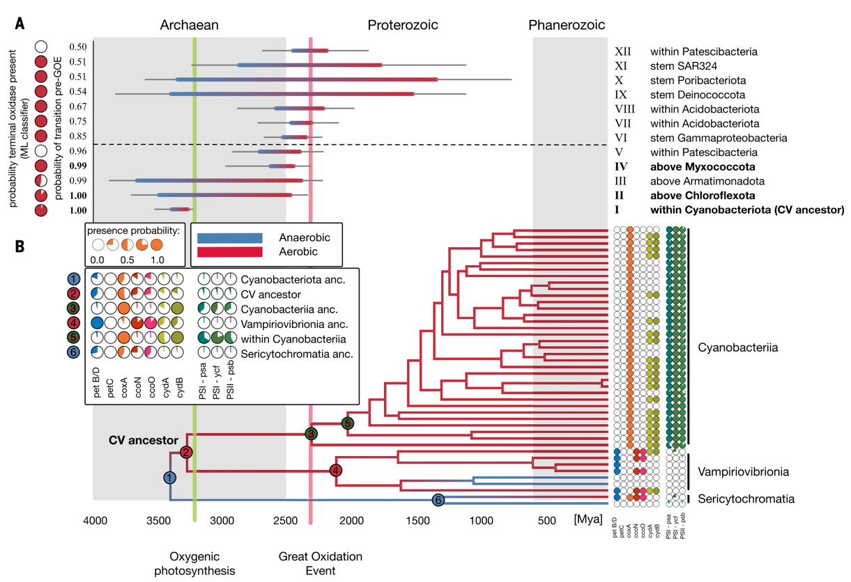 最早的一次有氧代谢转变推断发生在约32亿年前,即至少早于GOE约9亿年,出现在蓝细菌纲 Cyanobacteriia 与 Vampirovibrionia 的共同祖先(以下简称 CV 祖先,图4B节点2)。有意思的是,关键的产氧光合作用基因最早出现在蓝细菌纲Cyanobacteriia的祖先中(图 4B节点 3),其时间晚于该谱系中有氧代谢能力的出现。这支持了这样一个假设:有氧代谢能力的获得可能是产氧光合作用演化的必要前提,并可能促进了其进化,因为早期蓝细菌能够利用这种适应性来应对或甚至利用其自身产生的氧气。