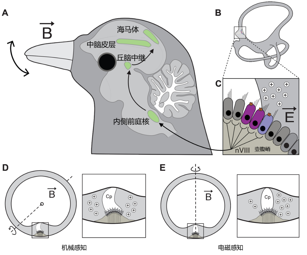 图1 电磁感应驱动的磁感知回路模型。 (A至C) 头部运动产生的变化磁场在半规管中诱导出电场(E),导致内淋巴液内形成电压梯度(B)。被凝胶状的壶腹帽分隔开的这种电荷差异,由表达电压敏感性钙通道CaV1.3和大电导钙激活钾通道BK的II型毛细胞检测(C)。这一电磁信息从壶腹嵴(ca)经由前庭耳蜗神经(nVIII)传至内侧前庭核(VeM)进行初步处理,随后通过丘脑中继(DTh),与中脑皮层(MC)和海马体(Hp)内的其他感觉信息整合。(D) 头部在半规管平面内的旋转通过壶腹帽(Cp)的位移导致毛细胞静纤毛的机械性刺激,不产生电磁感应。(E) 相反,在存在磁场向量(B)的情况下,头部垂直于半规管平面的旋转会导致电荷在壶腹帽两侧重新分布,而毛细胞不发生机械位移。因此,鸟类能够区分机械性输入和电磁性输入