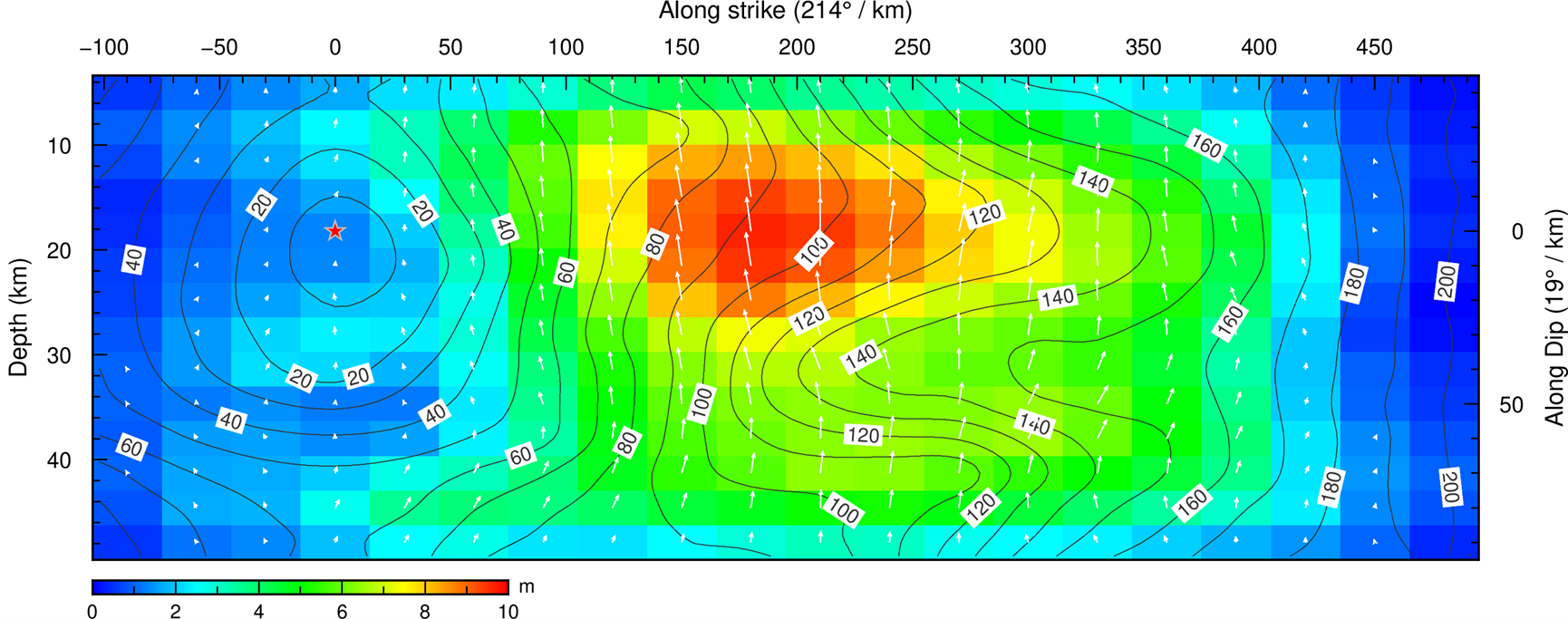 3.破裂速度:最大滑动量约为9.6 m,矩心深度为26.9km,加权破裂速度为 2.0 km/s。