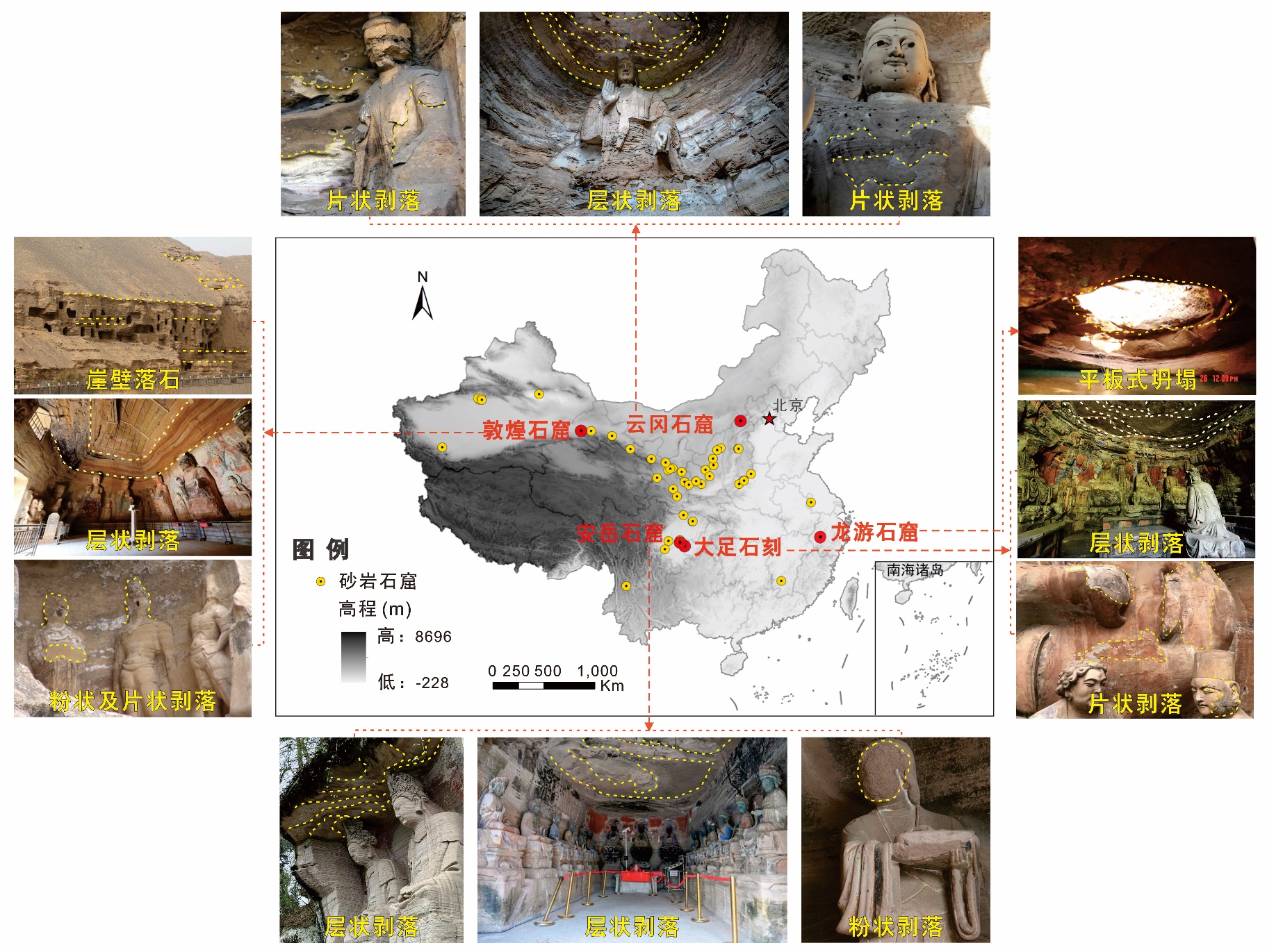 石窟多赋存在易于开凿且具有较好的自稳能力的岩体中,几乎涵盖了沉积岩、岩浆岩与变质岩三大类型,以砂岩、灰岩、大理岩、花岗岩等居多。据全国石窟寺专项调查,我国石窟共5986处,其中约80%以上的石窟均开凿于砂岩之中,包括著名的莫高窟、云冈石窟和麦积山石窟等。然而,历经千百年沧桑,我国70%以上的石窟均遭受了不同程度的劣化及破坏,甚至造成了不可逆的文化信息层丢失,其损失难以用经济价值估量。由于大部分石窟砂岩以泥质、钙质胶结为主,遇水易崩解,层间裂隙发育,我国砂岩石窟的剥落病害极为突出,是仅次于缺失的最常见的劣化模式,也是砂岩石窟最难治理的劣化现象。