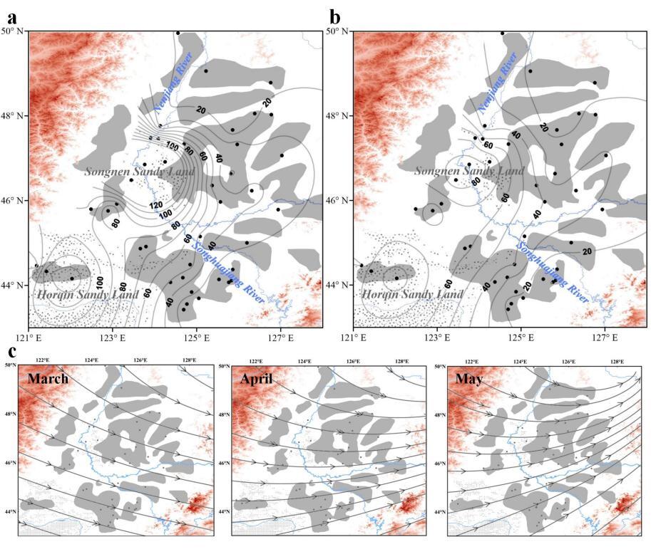 图2 东北黑土平均中值粒径(μm)(a)、砂含量(>63 μm%)(b)空间分布及尘暴季节风向(c)