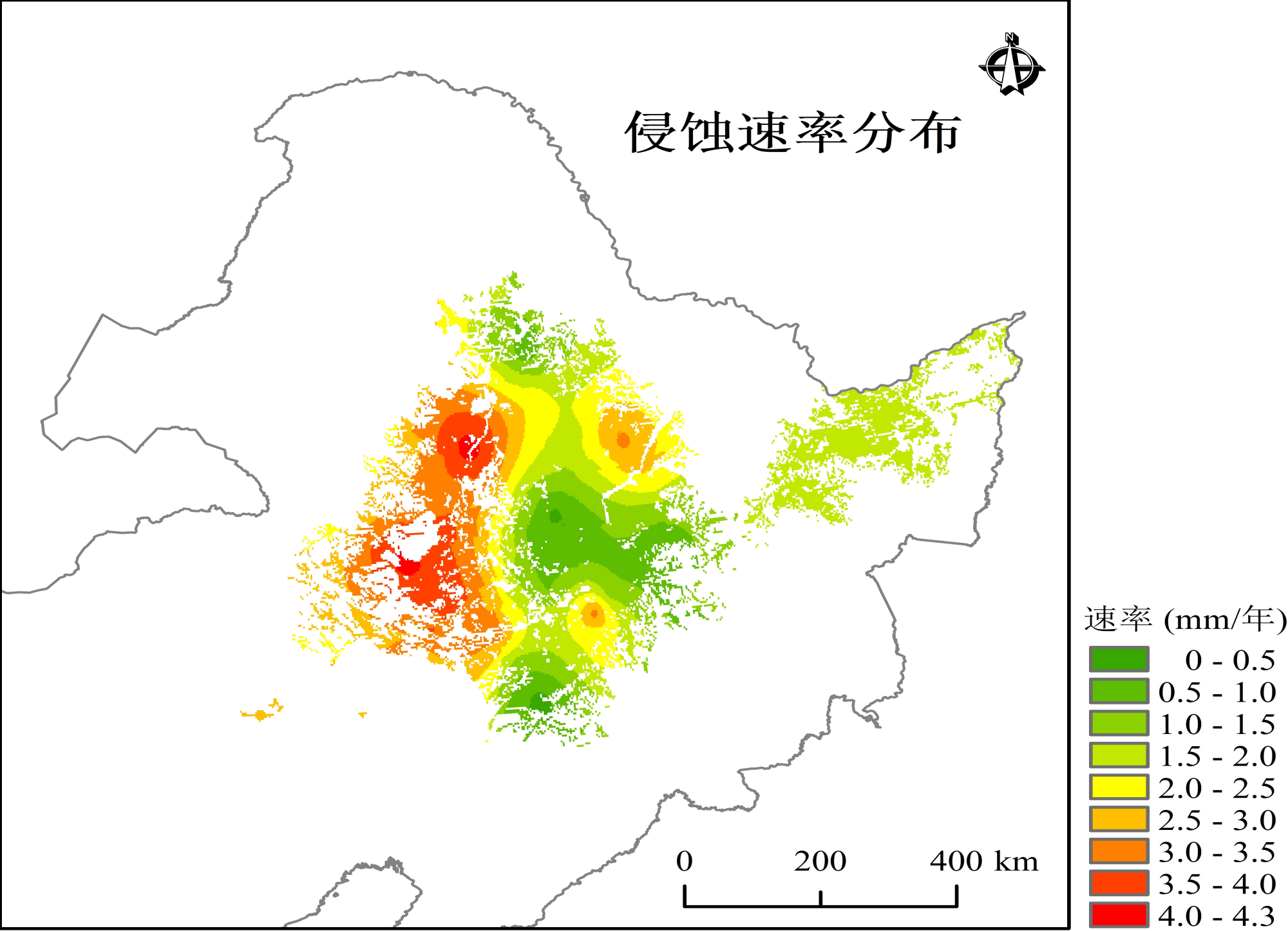 黑土侵蚀速率重建结果显示(图3),东北黑土区的侵蚀速率从西部(>3 mm/年)到东部(0‒3 mm/年)逐渐降低,平均侵蚀速率为2.22 mm/年(Wang et al., 2022)。通过进一步分析气象参数与黑土侵蚀速率空间分布,发现东北黑土区西部的侵蚀营力以风为主,东部以水为主,这一结论也在东北地区玛珥湖和水库的沉积速率记录中得到印证。