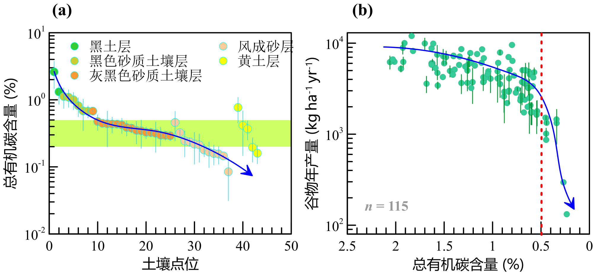 研究团队集成了全国土壤总有机碳(TOC)含量,发现土壤TOC含量下降至0.5%时,土壤发生明显退化(Guo et al., 2023; Cui et al., 2024;图4)。全国谷物年产量集成数据(图4)揭示,TOC含量下降至0.5%时,粮食产量显著下降,即使在人工施肥干预下,生产力也很难提升。由此可见,土壤TOC含量下降可以作为土壤退化的预警指示,即TOC含量小于0.5%时,土壤已经发生退化。