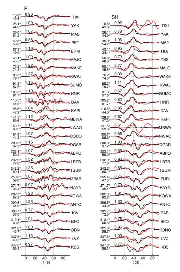 Comparison of observed (black) and synthetic waveforms (red) for P vertical components, and SH components are shown in the panel, the azimuth, epicentral distance, amplitude ratio and station name are also indicated.