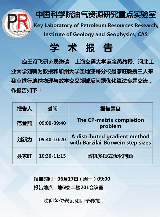 【6.17】油气室学术报告:范金燕 教授;刘新为 教授;聂家旺 教授