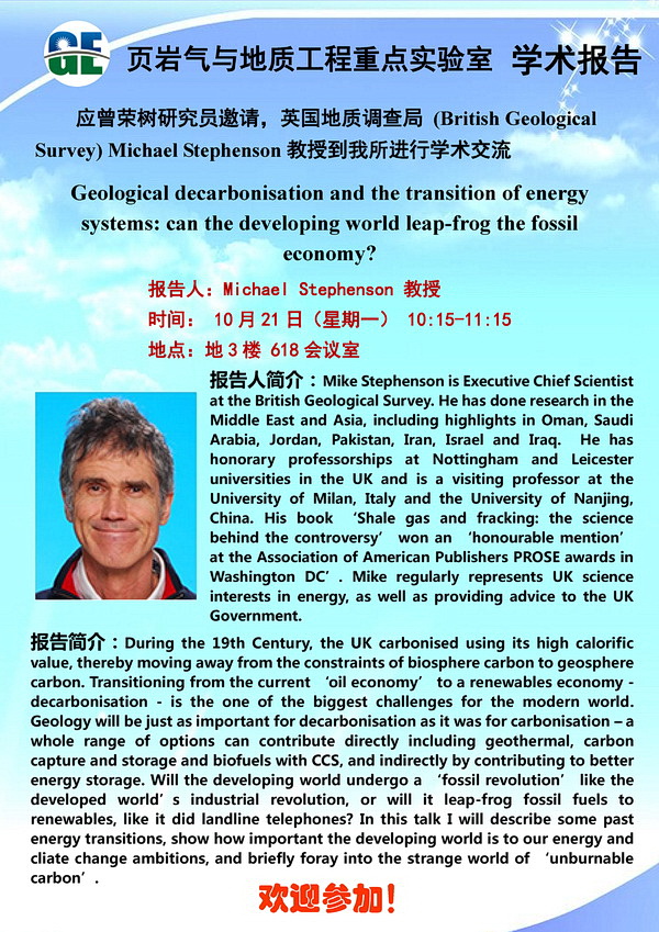 【10.21】页岩气室学术报告:Michael Stephenson 教授