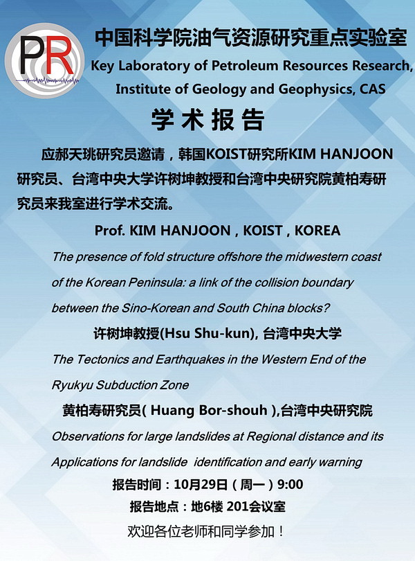 【10.29】油气室学术报告:Kim Hanjoon 研究员、许树坤 教授、黄柏寿 研究员