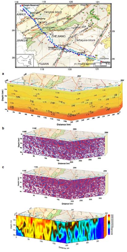 通过理论模型试验表明,其发展的方法可以用于重建地壳内部的多层各向异性结构,平均各向异性与区域应力场有关,而残差各向异性却与局部断裂有关,从而为研究层间耦合/解耦效应以及形变场特征等动力学问题提供重要的约束。通过将该方法应用于我国东南地区屯溪-温州宽角反射/折射地震剖面,揭示出扬子块体和华夏块体具有明显不同的各向异性属性特征,并支持江山-绍兴断裂为上述两个块体分界的观点;与断裂带在地表的分布相一致,地壳内部的地震各向异性分布也呈现四段不同的特征,可能与多阶段碰撞引起的地壳不同形变过程有关。