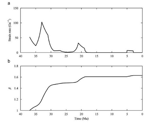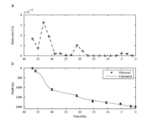研究岩石圈伸展作用下沉积盆地与张裂大陆边缘的形成过程非常重要。应变速率是反映应变快慢的一个物理量,无论是研究岩石圈变形过程,还是研究岩石圈的流变性质,应变速率都是一个非常重要的参数。一维应变速率反演方法可以通过盆地沉降数据获取岩石圈伸展过程的定量信息,给出应变速率、伸展因子、热流等随时间演化的数值。该方法基于有限拉张模型(与瞬时拉张模型相比,有限拉张模型与实际更为接近,它能描述拉张期间热流与沉降的演变过程。从这个意义上说,有限拉张模型具有更加广泛的应用价值),适用于多次拉张过程的研究,并无需人为划分拉张期次。