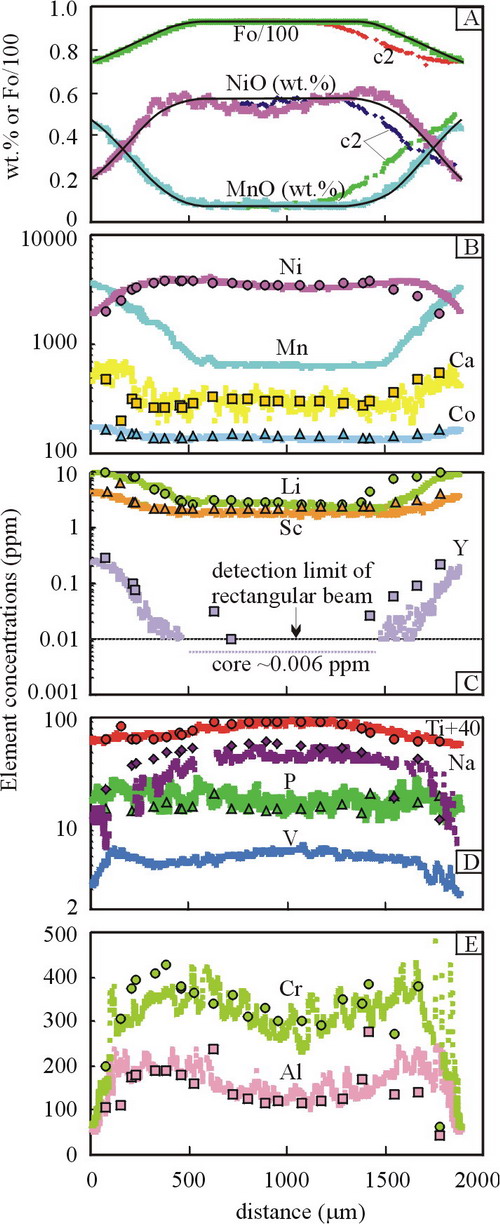 橄榄石是上部地幔和陨石中的主要组成矿物,而扩散速率是研究微观尺度上元素在橄榄石中运移的基本参数。长期以来,国际上对橄榄石中主量、微量元素的扩散进行了大量深入的研究,但主要都是通过扩散实验完成的。受制于实验时间和测试手段,实验温度一般显著高于1000℃,实验条件(如氧逸度、水活度和元素浓度等)也迥异于自然条件;不同实验室获得的Li和稀土元素的扩散速率差别可达3~6个数量级。