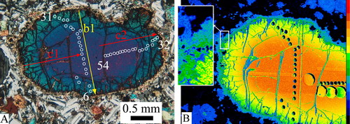 图1 A为正交偏光下橄榄石捕虏晶的显微镜照片;B为显示橄榄石中Mg含量变化的x光图像。图A中彩色箭头表示沿b轴(b1)和c轴(c1和c2)使用矩形激光束斑进行连续数据采集的剖面,束斑规格为70×7 µm;白色圆圈表示使用圆形激光束斑进行样品采集的位置,束斑直径为70 µm。