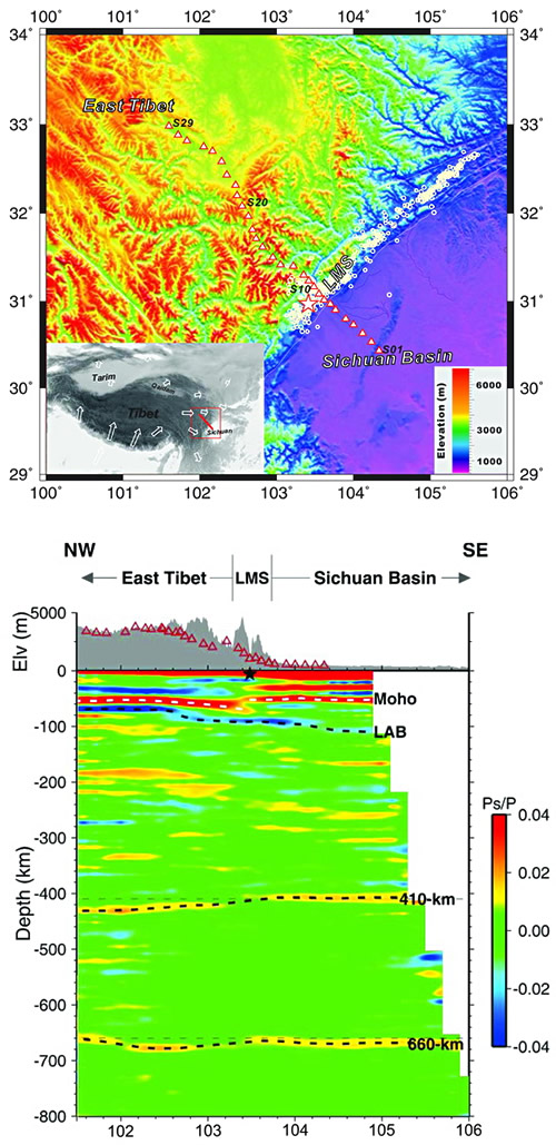图注:青藏高原东部与四川盆地之间宽频带流动地震台站位置(三角形图标)及接收函数成像结果