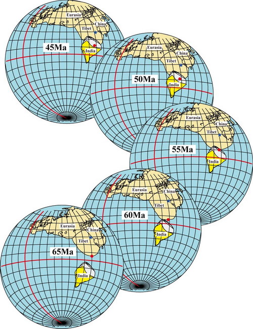 附图1:根据古地磁结果重建的印度与亚洲大陆65-45Ma的运动过程