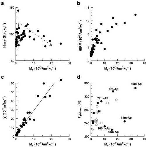 地质与地球物理研究所岩石圈演化国家重点实验室的刘青松研究员及其研究小组,最近详细研究了西班牙西北部的一个土壤时序系列(soil choronosequence)的磁学性质。与中国黄土高原沉积的黄土-古土壤序列不同,西班牙的土壤序列一直处于动态的环境之中,从而有机会追踪到磁性矿物转化过程的中间产物。研究发现:1)成土作用过程中,磁性增强分为两个阶段。在初始阶段,磁性矿物的粒径逐渐增大;之后,当颗粒的平均粒径达到~25nm(超顺磁和单畴颗粒的临界点)后,平均粒径保持稳定,磁性矿物含量的增加是磁性增强的主导因素;2)磁赤铁矿的含量和赤铁矿的含量线性相关。上述证据更加支持第二种磁性增强的机制。